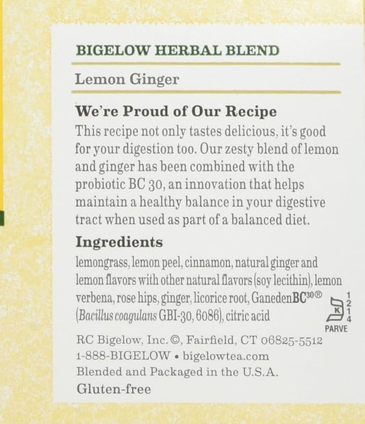 Bigelow Lemon Ginger Herbal Tea Bags 28-Count Box (Pack of 1) Lemon Ginger Tea Bags Herbal Tea All Natural Gluten Free