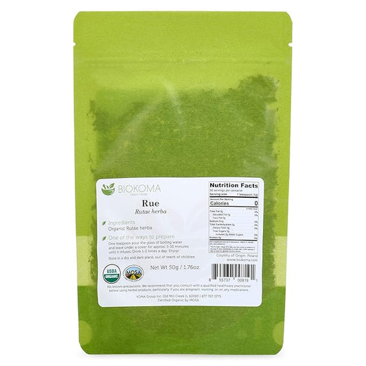 Biokoma Pure and Organic Rue Dried Herb 50g in Resealable Moisture Proof Pouch, USDA Certified Organic - Herbal Tea, No Additives, No Preservatives, No GMO, Kosher