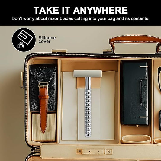 Double Edge Safety Razor for Men with Stand and Silicone Cover - Durable Metal Eco-Friendly Single Blade Safety Razor with 10 Blades- Closed Smooth Shave (Silver)