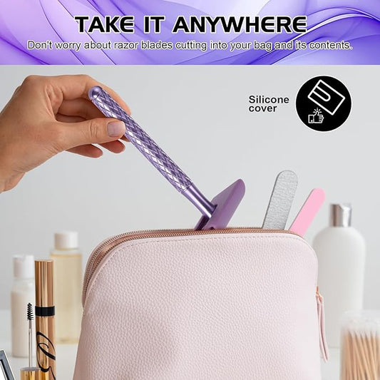 Double Edge Safety Razor for Women Purple with 10 Blades and Silicone Cover - Durable Metal Eco-Friendly Single Blade Razor - Closed Smooth Shave
