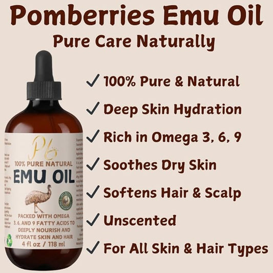 Emu Oil, 100% Pure Australian Emu Oil – Refined & Unscented – Natural Moisturizer for Hair, Skin, Face & Body – Helps with Scars, Dry Skin & Massage – 4 fl oz Glass Bottle