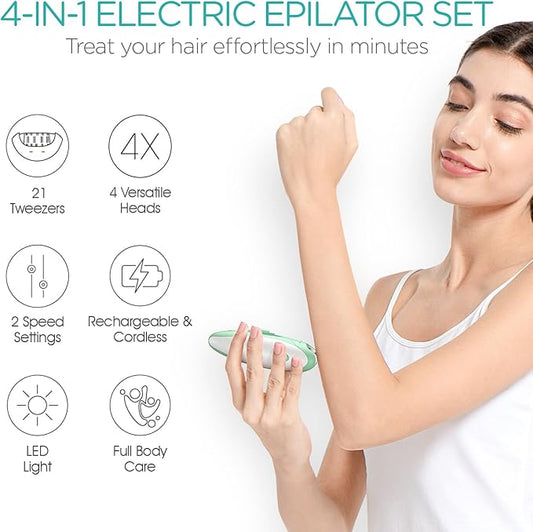 Epilator for Women-Cordless Epilators Hair Removal for Women, 4-in-1 Electric Razor Hair Remover, 2 Speeds & 21 Tweezers for Face Legs Arms Armpit Bikini, Green HR310