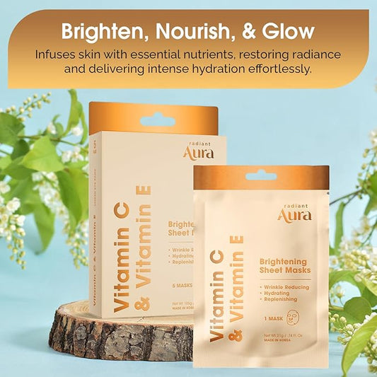 Face Sheet Mask with Vitamin C & E - Dermatologist Tested Korean Beauty Mask for Brightening & Deep Hydration - Premium Facial Treatment for Glowing & Rejuvenated Skin - 5 Pack