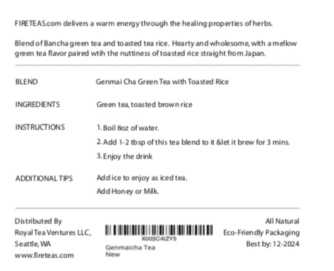 FIRE TEAS Genmaicha Green Tea - Loose Leaf Tea -
