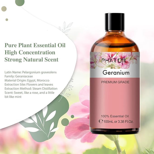 Geranium 3.38fl.oz Essential Oil, PHATOIL Aromatherapy Essential Oils for Diffuser, Humidifier, Perfect for DIY Soap, Candle, Bath Bombs Making(100ml)