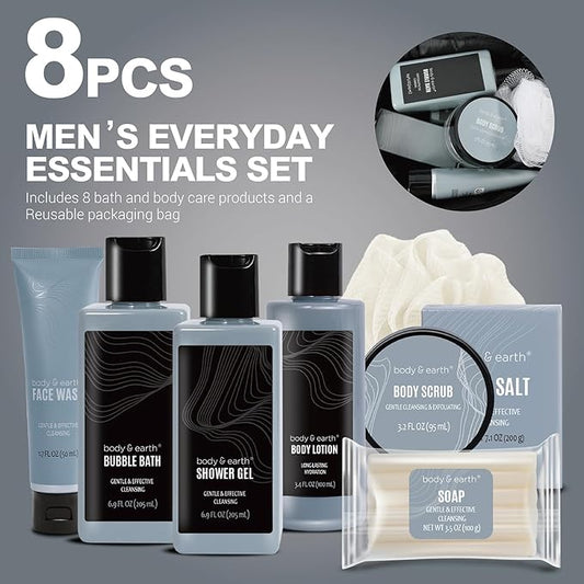 Gift Baskets for Men Body Wash Set Body & Earth Leathers Mens Bath Set with Body Lotion, Face Wash, Shower Gel, Bubble Bath, Loofah & More, Birthday Gifts for Men,regalos para hombre,Christmas Gifts