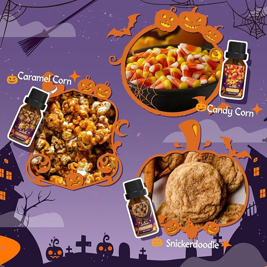 Halloween Essential Oils Set, Fragrance Oil Gift Set for Oil Diffusers, Scented Oils 6x10ml - Caramel Apples, Pumpkin Pie, Candy Corn, Halloween Cookies, Chocolate Bars, Popcorn Balls