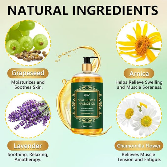 Sore Muscle Massage Oil for Massage, with Massage Roller Ball & Thumb Saver Massager, Body Massage Oil (8 Fl Oz)