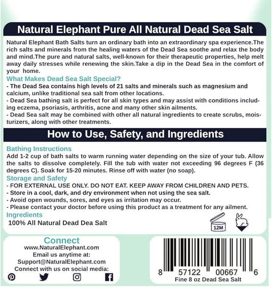 Natural Elephant Dead Sea Bath Salt | 8oz Travel Size | 100% Natural and Pure | Fine Grain | Ideal for Baths and Soaks