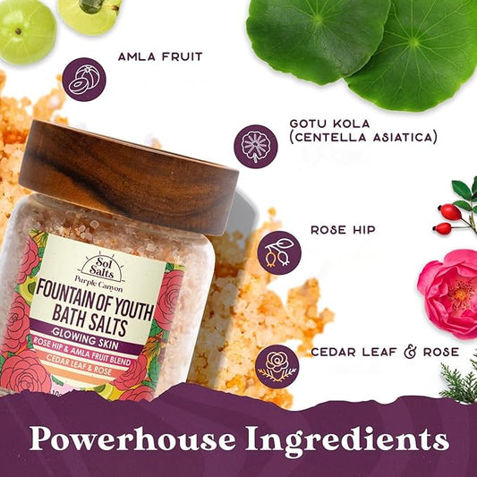 PURPLE CANYON SolSalts Fountain of Youth Bath Salts | Lavender, Rose, & Cedar Leaf Scented Detox Soak with Epsom Salt, Amla & Rosehip for Glowing Skin