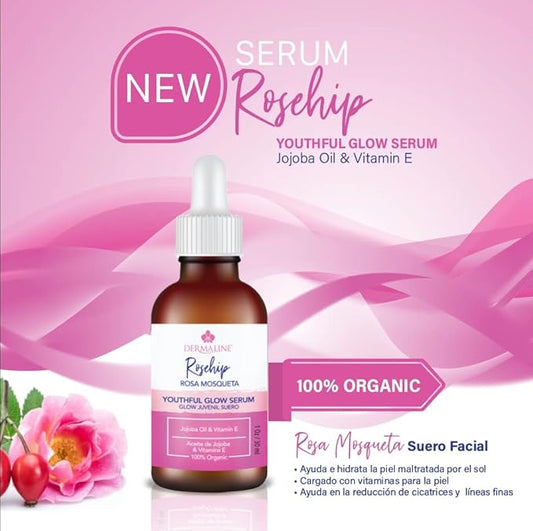 Dermaline Organic Rosa Mosqueta Rosehip Seed Oil 100% Pure Virgin Serum for Face with Jojoba Oil and Vitamin E