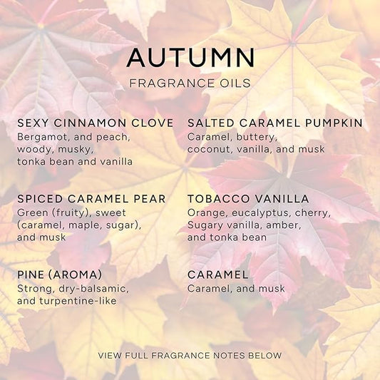 Eternal Essence Oils Autumn Set of 6 Premium Fragrance Oils - Includes Sexy Cinnamon Clove, Salted Caramel Pumpkin, Spiced Caramel Pear, Tobacco Vanilla, Pine, and Caramel Scented Oils - 10ML