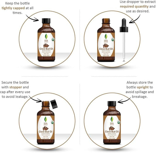 SVA Clove Essential Oil Organic – 4 Fl Oz – 100% Natural Organic Clove Oil - for Diffuser, Hair Care, Face, Skin Care, Aromatherapy, Scalp and Body Massage, Soap and Candle Making - with Dropper