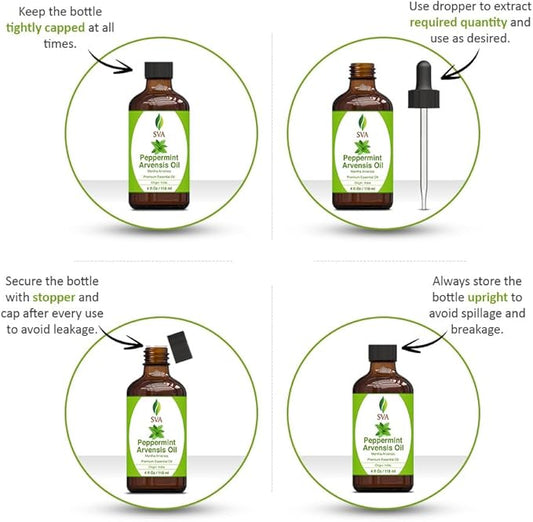 SVA Peppermint Essential Oil – 4 Fl Oz – 100% Natural Peppermint Oil - for Diffuser, Hair Care, Face, Skin Care, Aromatherapy, Scalp and Body Massage, Soap and Candle Making - with Dropper