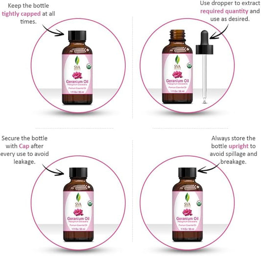 SVA Geranium Essential Oil Organic – 1 Fl Oz – 100% Natural Organic Geranium Oil - for Diffuser, Hair Care, Face, Skin Care, Aromatherapy, Scalp and Body Massage, Soap and Candle making – with Dropper
