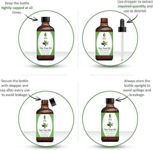 SVA Tea Tree Essential Oil – 4 Fl Oz – 100% Natural Tea Tree Oil - for Diffuser, Hair Care, Face, Skin Care, Aromatherapy, Scalp and Body Massage, Soap and Candle Making – with Dropper