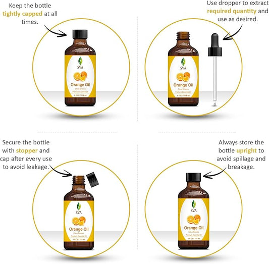SVA Orange Essential Oil – 4 Fl Oz – 100% Natural Orange Oil - for Diffuser, Hair Care, Face, Skin Care, Aromatherapy, Scalp and Body Massage, Soap and Candle Making - with Dropper