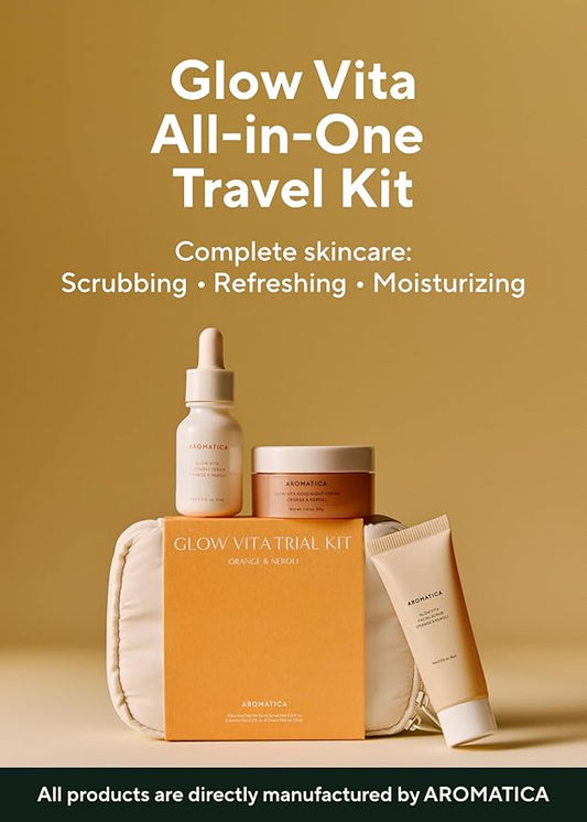 AROMATICA Glow Vita Trial Kit - Travel Size Skin Care Set [Vitamin C Serum 0.5 fl.oz, Facial Scrub 0.5 fl.oz, Goodnight Cream with Retinol 1oz] - Travel Kit for Women | Mothers day gifts for mom