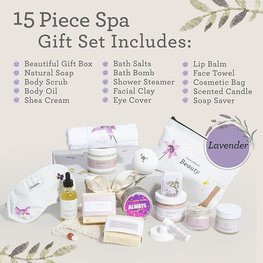Lizush Luxury Spa Gifts for Women - 15 Piece Lavender Gifts for Her, Gift Baskets for Women, Body Care Set for Mom, Birthday Box, Self Care Spa Kit For Wife - Handmade in the USA