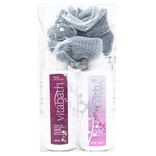 Vitabath Plus For Dry Skin Everyday Skincare Set Moisturizing Shower Gel Wash, Reviving Lotion & Exfoliating Body Scrubber Pouf - Nourishing Foam Cleanser & Dry Skin Hydration for Women & Men