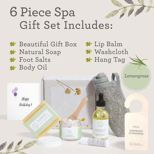 Lizush Lemongrass 6-Piece Spa Gift Set for Women - Relaxing Self-Care Basket, Luxury Handmade Body Care Items for Premium Relaxation - Happy Birthday - Handmade in the USA