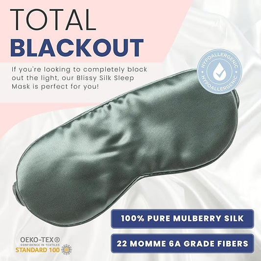 Blissy Silk Sleep Mask - Silk Eye Sleeping Mask for Women & Men for Total Blackout - 100% Pure Mulberry Silk, 22 Momme 6a Fibers - Blindfold Silk Sleep Mask Side Sleeper Eye Cover (Ash Blue)