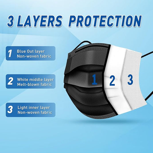 100 Pack Medical Grade Black Disposable Face Masks-Protective 3 Ply Face Mask for Adults, Comfortable,Soft, Breathable