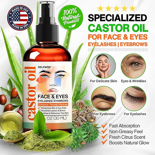 Organic Castor Oil For Face Moisturizer, Eyes, Eyelashes, Eyebrows, Wrinkles with Jojoba, Rosehip, Grapeseed, Squalane, Palmarosa, Bergamot and Vitamin E for Gentle Skin, Men & Women 1oz