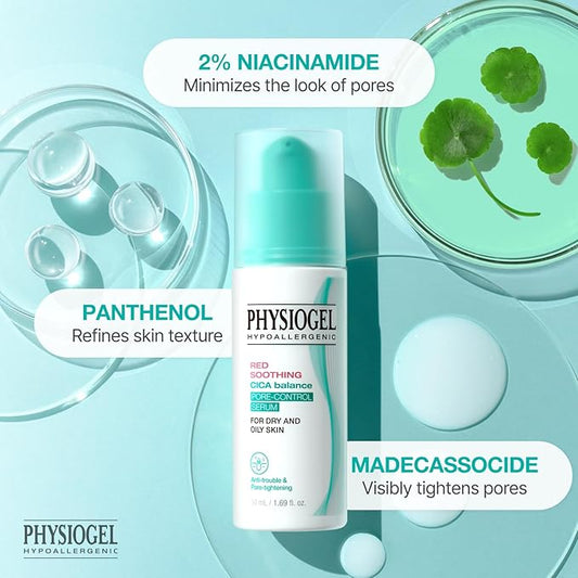 Physiogel Red Soothing CICA Balance Pore-Control Serum, Niacinamide Facial Exfoliant for Blackheads, Pore Minimizer Serum for Face, Korean skin care, 1.69 fl.oz