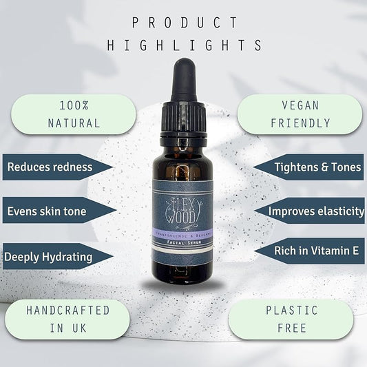 The Ilex Wood - Frankincense and Bergamot Facial Serum - 100% Natural, Vegan, Moisturising for both Men & Women, Cruelty Free, Anti Ageing, Wrinkle and Line Reducing Ingredients - 20ml (0.68 fl oz)