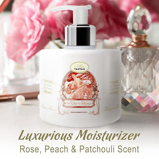 Un Air d'Antan Hand Cream for Dry Cracked Hands 10.5oz - Hand Lotion Pump, Non Greasy Moisturizer with Essential Oils, Cruelty Free Formula - Rose Peach Patchouli