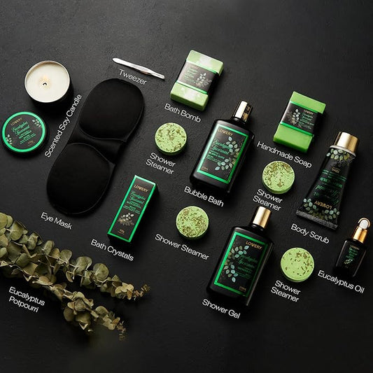 Mothers Day Gifts, Eucalyptus Spearmint Bath Set, Home Spa Set with Natural Mint Fragrance, 17 Pcs Gift Basket, Eucalyptus Bath Oil, Shower Gel, Bubble Bath, Bath Crystal, Steamer Tablet & More