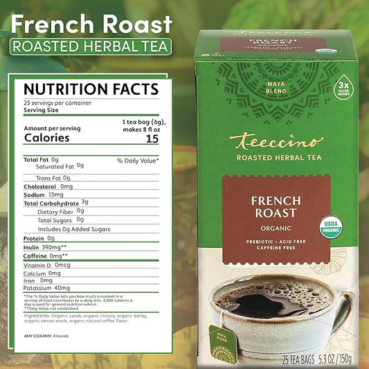 Teeccino French Roast Herbal Tea - Rich & Roasted Herbal Tea That’s Caffeine Free & Prebiotic for Natural Energy, Coffee Alternative, 25 Tea Bags