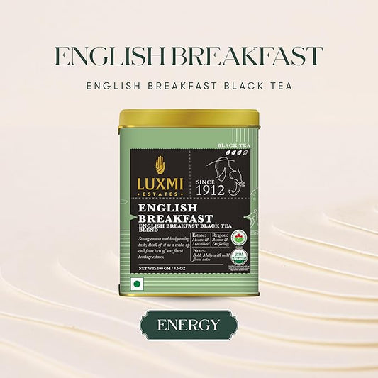 Luxmi Estates - Tale of Two Estates - Organic English Breakfast Tea - Loose Leaf - 100g (50 Cups) | Made with Organic Darjeeling & Assam Tea from India | Smooth, Flavorful, Robust and Caffeinated