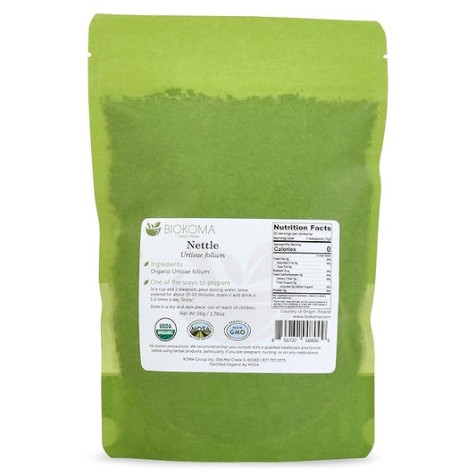 Biokoma Pure and Organic Nettle Dried Leaves 50g (1.76oz) in Resealable Moisture Proof Pouch, USDA Certified Organic - Herbal Tea, No Additives, No Preservatives, No GMO, Kosher