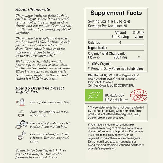Wild Bliss Organic Chamomile Tea - Caffeine Free Calming Herbal Support - Pharmacopoeia Potency - 20 Plant Based Tea Bags