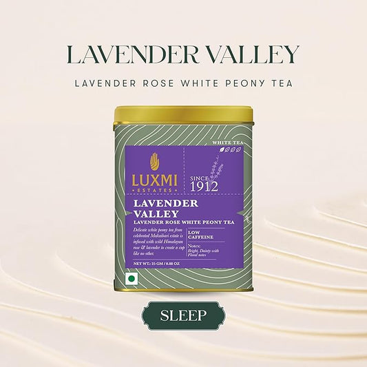 Luxmi Estates - Lavender Valley - Organic Lavender Tea - Loose Leaf - 25g (12 Cups) | With Certified Organic Darjeeling Makaibari White Tea | Light & Fresh Delicate Flavor, Low Caffeine