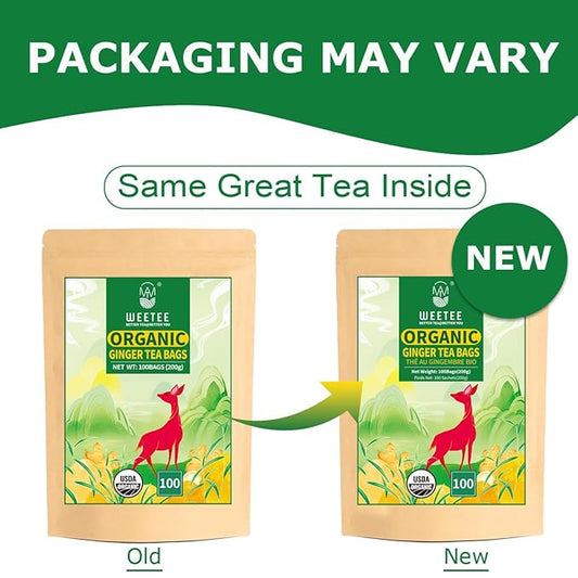 WT WEETEE Organic Ginger Tea Bags, 100% Pure Ginger Root Tea 100 Count, Caffeine Free, No Spices, No Flavors