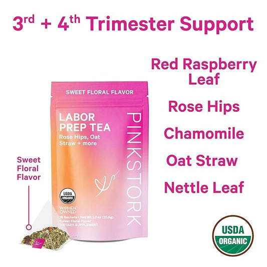 Pink Stork Labor Prep Tea, Organic Red Raspberry Leaf with Chamomile and Rosehip, Caffeine-Free, Pregnancy Must Haves, Labor and Delivery Essentials, Third Trimester Pregnancy - 15 Sachets