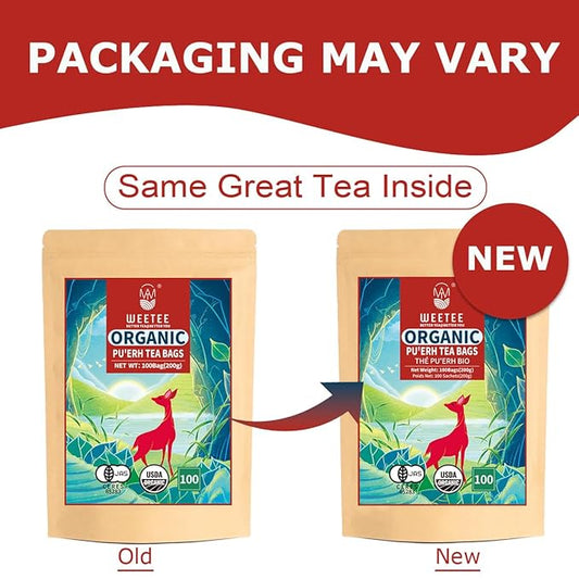 WT WEETEE Organic Puerh Tea Bags, Organic Ripe Pu'erh Tea 100 Count, Smooth, Subtly Sweet, Earthy Dark Tea Black Tea, Rich Antioxidants