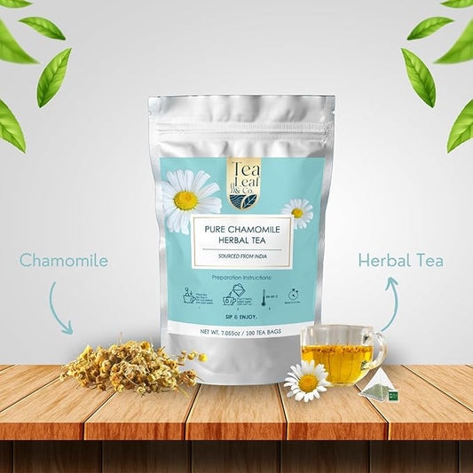 Tealeaf & Co. Pure Chamomile Herbal Tea - Organic Chamomile Tea Bags Blended with Fresh Herbs - Contains Low Caffeine - Gluten Free - 100 Teabags (7.055oz/200gm)