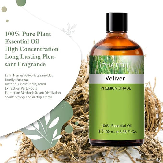 Vetiver 3.38fl.oz Essential Oil, PHATOIL Pure Aromatherapy Oils for Diffuser, Humidifier, Perfect for DIY Soap, Candle, Bath Bombs Making(100ml)