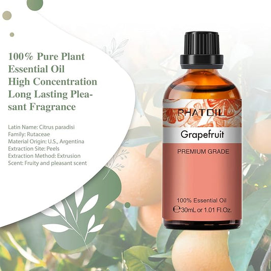 Grapefruit Essential Oil, 1.01Fl.Oz (30ML) PHATOIL Pure Essential Oil Singles for Aromatherapy Diffusers, Humidifiers, Great for DIY Candle and Soap Making, Gift for Friend