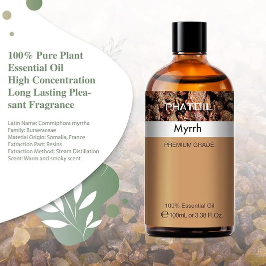 Myrrh 3.38fl.oz Essential Oil, PHATOIL Pure Aromatherapy Oils for Diffuser, Humidifier, Perfect for DIY Soap, Candle, Bath Bombs Making(100ml)