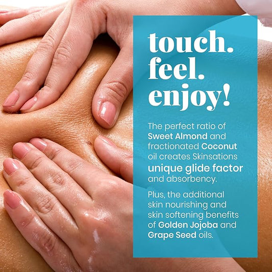 Skinsations - Vanilla Massage Oil for Massage Therapy - 16oz | Silky-Soft Blend of Sweet Almond, Fractionated Coconut, Grapeseed and Jojoba Oil | Scented Body Oil, Sore Muscles, Aromatherapy