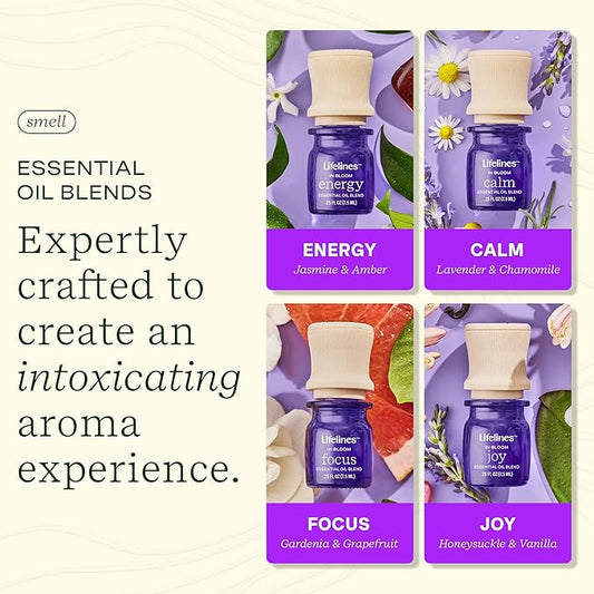 Lifelines Essential Oil Blends, 4-Pack - Blended Essential Oils with Precision Pump for Aromatherapy Diffusers - Long-Lasting Scented Fragrance - in Bloom (Joy, Calm, Focus & Energy)