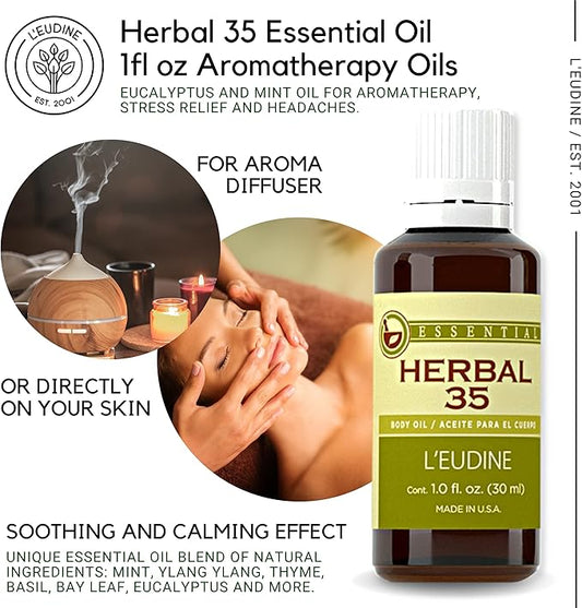 L'eudine Herbal 35 Essential Oil, Soothing and Calming Eucalyptus Essential Oil, Powerful Blend of up 35 Essential Oils for Aromatherapy & Wellness Support - 1fl oz