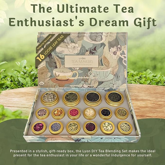 Lyon DIY Tea Blending Set-16 Tin Variety Pack-Premium Herbal Tea & Exotic Floral/Fruit Flavor Infusers - Create 75+ Cups w/Assorted Teas, Oolong, Chamomile, Rose, Peach & More