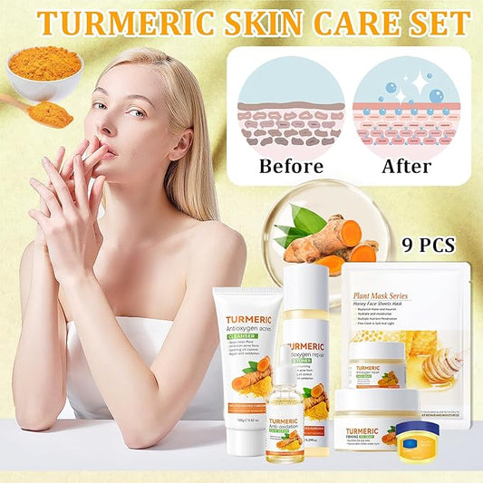 9 Pcs Turmeric Skin Care Set with Facial Cleanser,Toner,Face Serum,Face Cream,Eye Cream,Moisturizing Lip Balm,Hydrating Face Sheet Masks Skin Care Kit for Women and Men