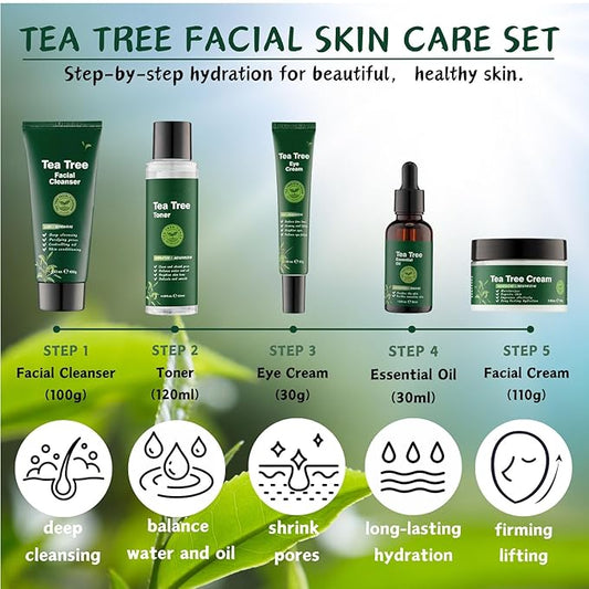 Tea Tree Skincare Set Mother's Day Gifts - 5 Pcs Skin Care Set - Skincare for Girls 10-12 - Skin Care for Teens 10-12 - Gift Set for Women with Cleanser,Toner,Face Cream,Eye Cream,Essential Oil